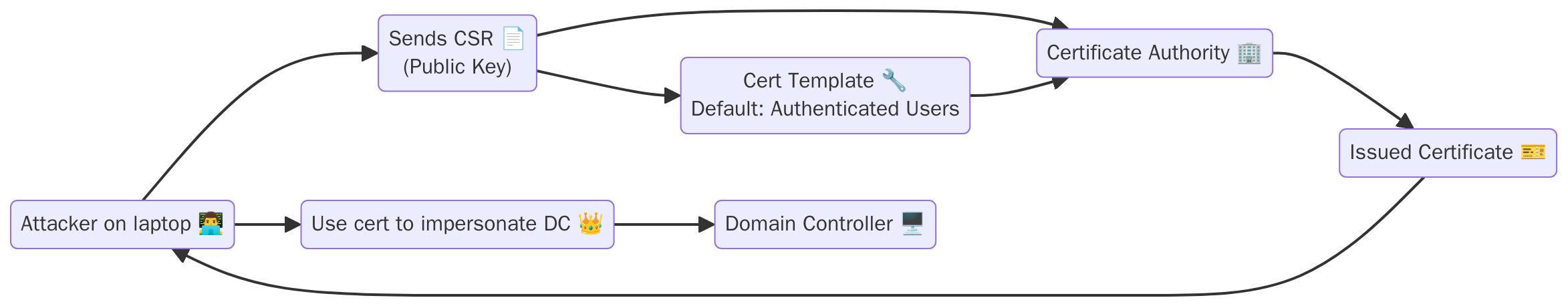 Even when “Authenticated Users” is not present, over-permissive groups often are. And in most environments, there is no alerting on group membership changes. The logging may exist, but the signals are lost in the noise. A user requesting a certificate from a trusted template looks legitimate. Until you realise that certificate grants domain-level access, bypasses MFA, and never touches a password.